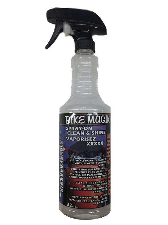 DIRECTIONS: Mist Bike Magik Qwik Shine on cool, dry finish; buff lightly with a soft cloth. For best results we recommend washing surface first with Motorcycle Wash and using a Microfiber Towel to buff finish.